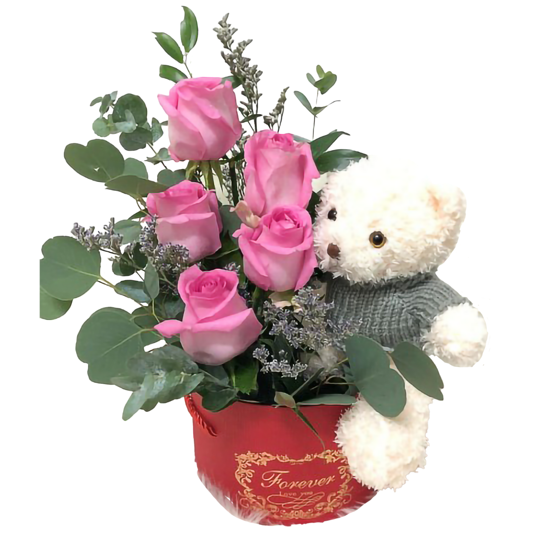 A delightful composition of mixed roses, accented with delicate seasonal flowers and accompanied by an adorable cutie bear. Each arrangement is thoughtfully handcrafted by our florists, ensuring a unique creation that radiates charm and elegance. Please note that the final product may differ slightly from the image shown.