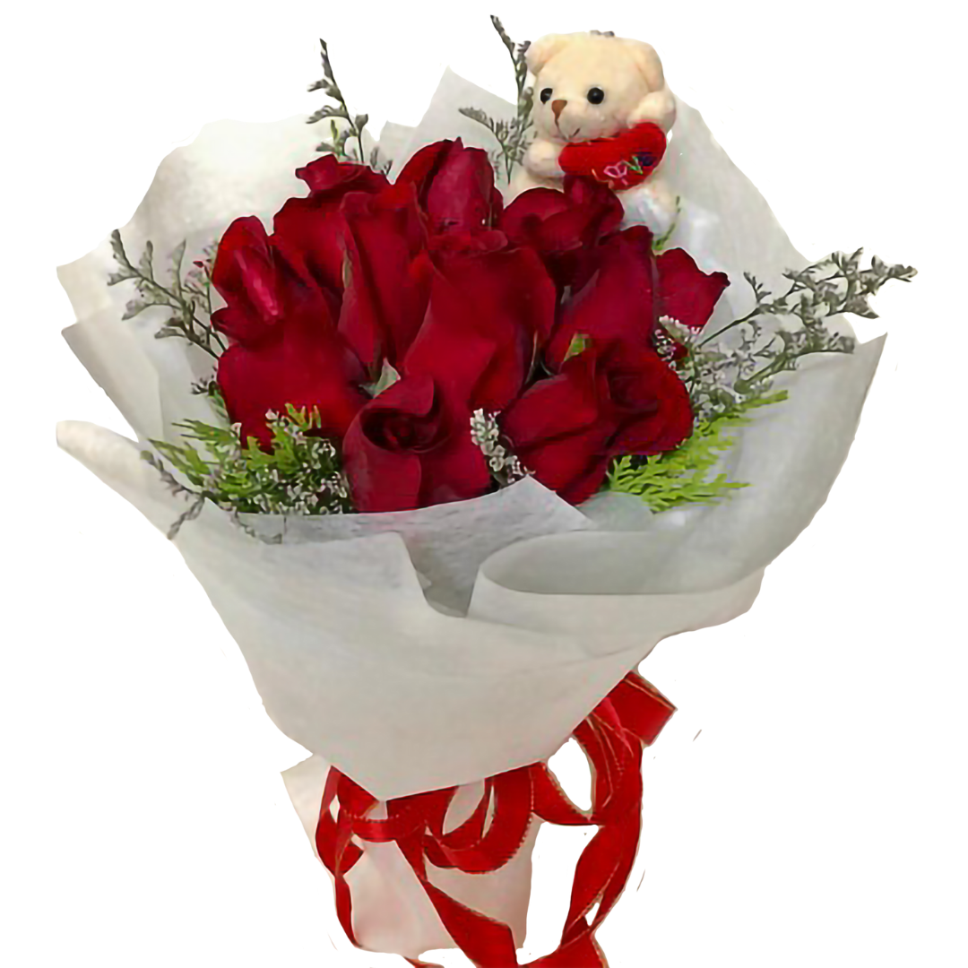 A charming bouquet of classic red roses accented with lush foliage, accompanied by an adorable cutie bear for an extra touch of warmth and delight. Each arrangement is handcrafted with care, making it a thoughtful gift full of elegance and sentiment. Please note that the final creation may vary slightly from the image shown.
