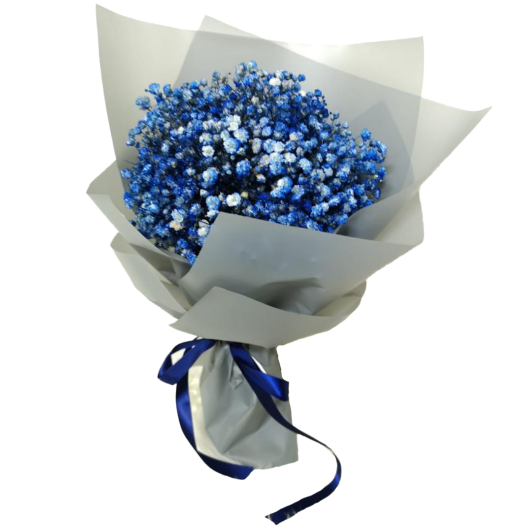 A serene and elegant bouquet of soft blue gypsophila, beautifully arranged with fresh foliage to create a delicate and sophisticated display. Each arrangement is handcrafted with care, making every bouquet uniquely charming. Please note that the final bouquet may differ slightly from the image shown.