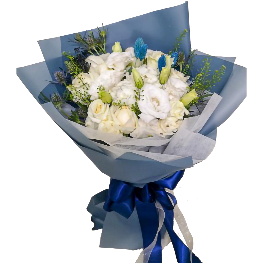 An elegant bouquet of pure white roses paired with delicate white eustoma and a selection of seasonal flowers, complemented by fresh foliage. Each arrangement is carefully handcrafted, ensuring a unique and refined floral presentation. Please note that the final bouquet may differ slightly from the image shown.
